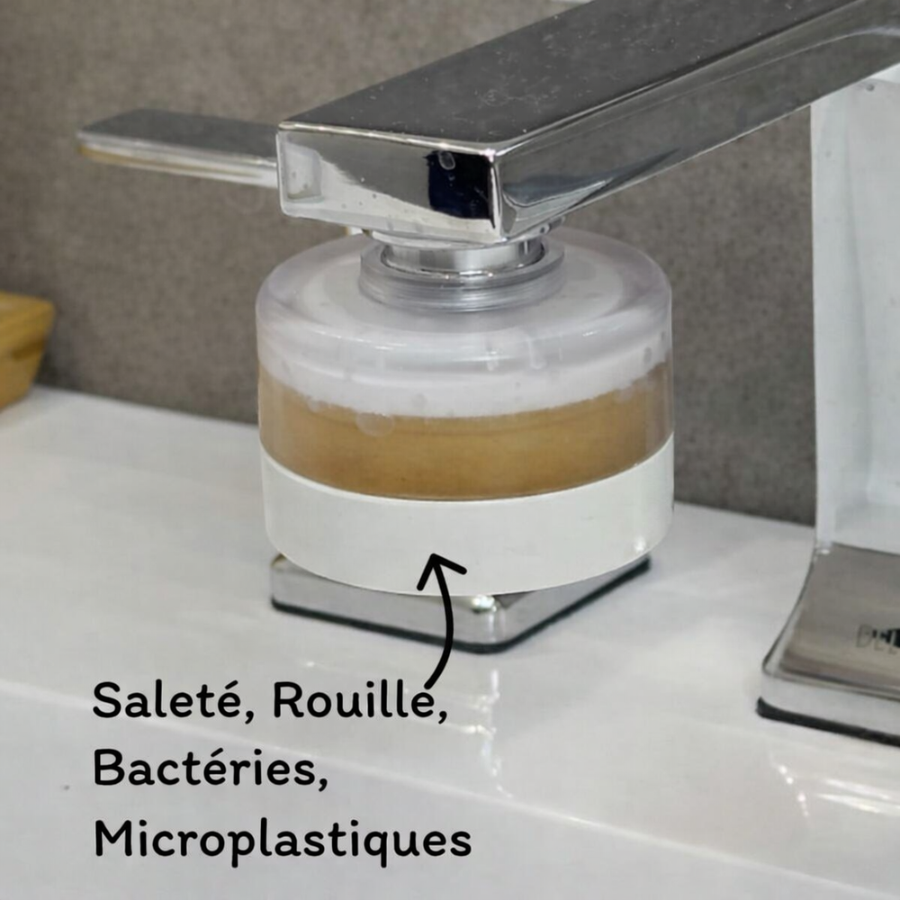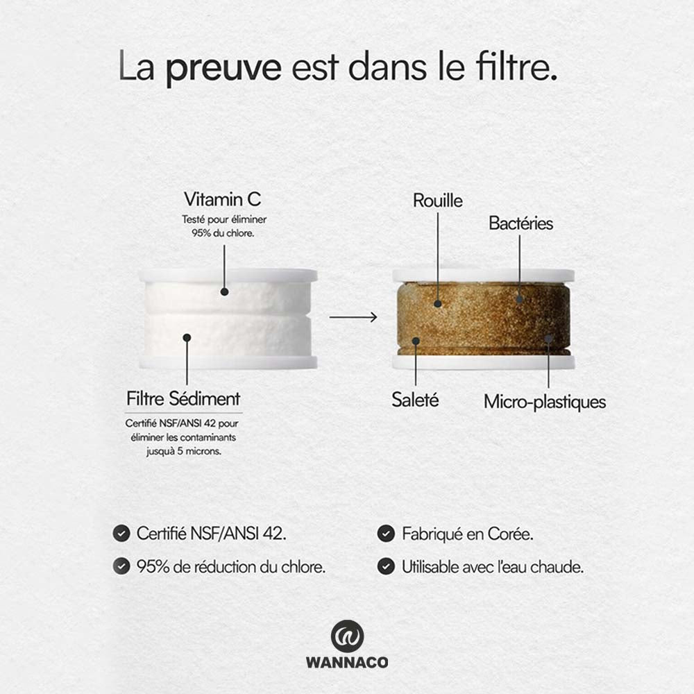 Le filtre WANNACO PureSkin est conçu pour conserver toute son efficacité, même sous des températures élevées. Lorsque l’eau traverse le filtre, elle passe d’abord par une couche de sédiments de 5 microns qui élimine la saleté, la rouille, les bactéries, les microplastiques et autres impuretés — jusqu’à 10 fois plus petites qu’un grain de sable.